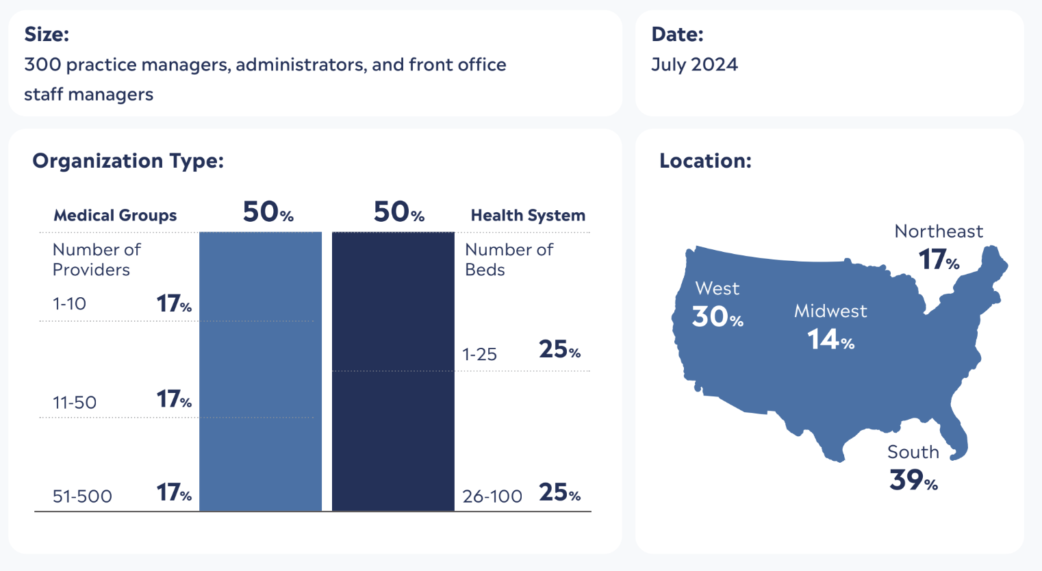 Findings in Progress, Not Perfection: Care Access in the Digital Era are based on a survey of 300 healthcare administrators at medical groups and small to medium health systems by Wakefield Research in July 2024 on behalf of Kyruus Health. All sample sizes in the report are n=300 unless otherwise noted. Percentages may not always total 100% due to rounding.